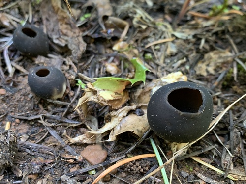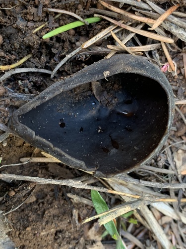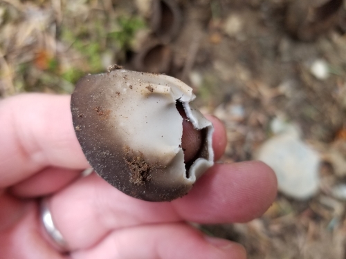Der 1–4 cm breite Hut ist braun-schwarz gefärbt. Die Form ist meist trichterförmig.