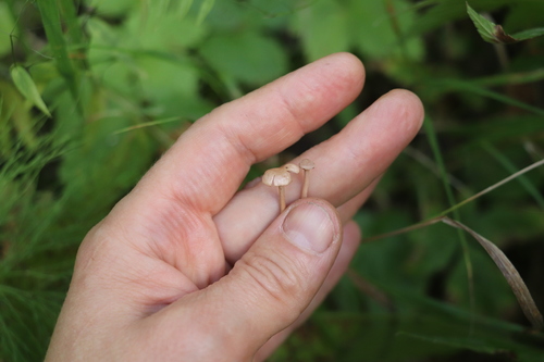Der 1–2 cm breite Hut ist braun-grau-weiß-gelb gefärbt. Die Form ist meist schirmförmig, kegelförmig, geriefter Hut. Er ist hygrophan (Die Hutfarbe ändert sich bei Feuchtigkeit).