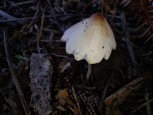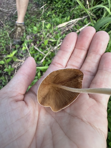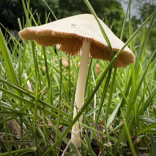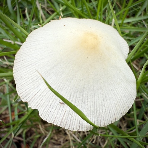Der 1–6 cm breite Hut ist weiß-gelb-braun gefärbt. Die Form ist meist kegelförmig, geriefter Hut. Er ist hygrophan (Die Hutfarbe ändert sich bei Feuchtigkeit).