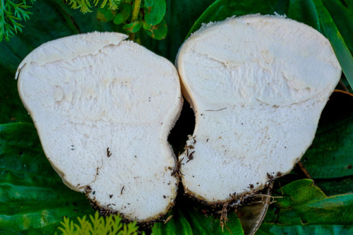 Der Stiel ist weiß-braun-gelb-orange. Besondere Merkmale: brüchig, Wurzelbasis.