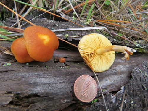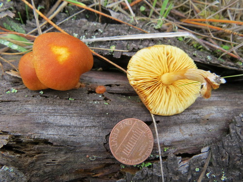 Der 2–9 cm breite Hut ist gelb-orange-rot gefärbt. Die Form ist meist kegelförmig, andere, schirmförmig. Er ist hygrophan (Die Hutfarbe ändert sich bei Feuchtigkeit).