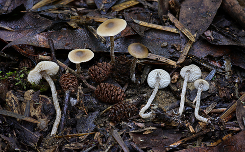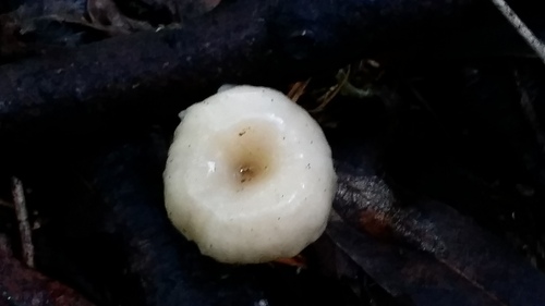 Der 2–8 cm breite Hut ist braun-grau-gelb-weiß-orange gefärbt. Die Form ist meist schirmförmig, andere, trichterförmig, geriefter Hut. Er ist hygrophan (Die Hutfarbe ändert sich bei Feuchtigkeit).