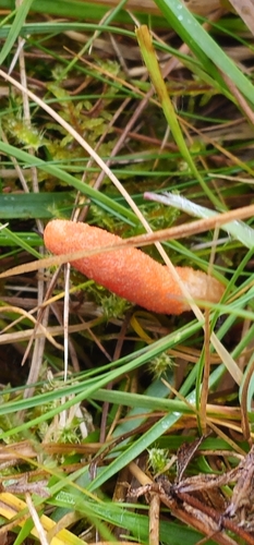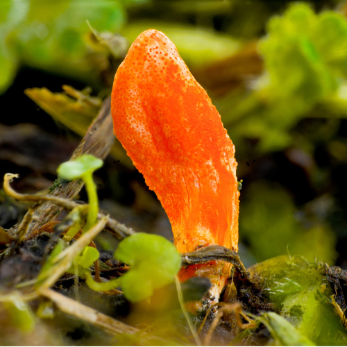 Der 1–1 cm breite Hut ist orange-rot-gelb gefärbt.