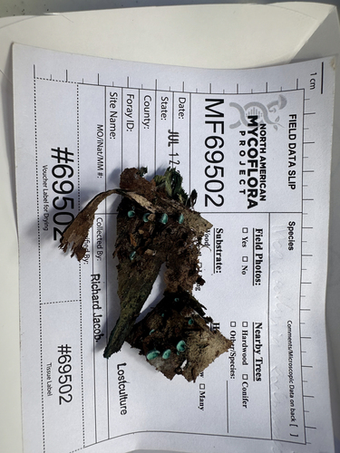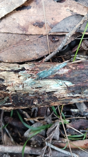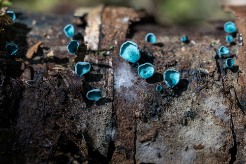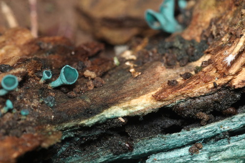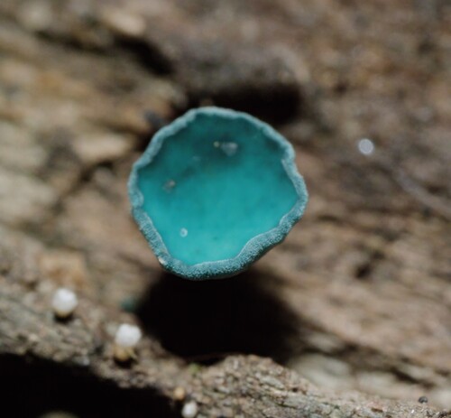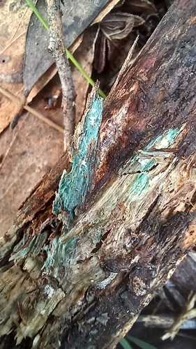Der Kleinsporiger Grünspanbecherling (Chlorociboria aeruginascens) ist ein Pilz mit dem Speisewert ungenießbar. Die Hauptsaison erstreckt sich von Juni bis November. Er wächst bevorzugt auf Holz.