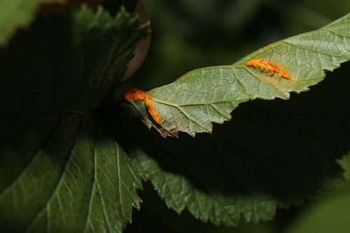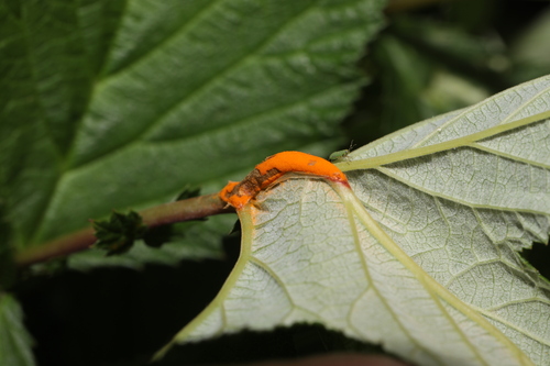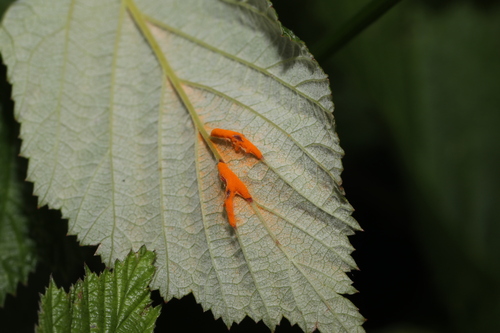 Der 1–1 cm breite Hut ist orange-rot gefärbt.