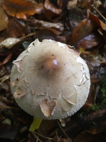 Der 4–20 cm breite Hut ist braun-weiß gefärbt. Die Form ist meist schirmförmig, andere, kegelförmig.