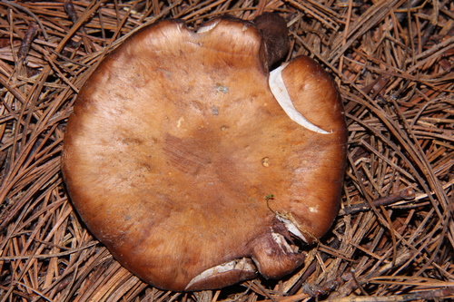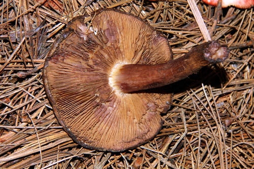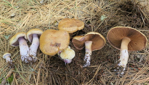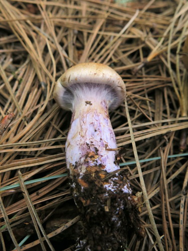 Der Stiel ist rosa-blau-braun. Besondere Merkmale: knollige Basis, faserig, Ring, flocken, genattert.