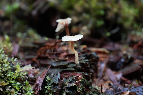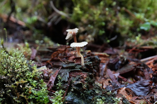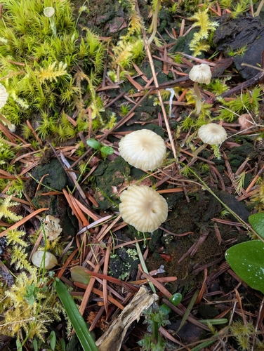 Der 1–3 cm breite Hut ist braun-orange-gelb-weiß gefärbt. Die Form ist meist trichterförmig, geriefter Hut, schirmförmig.