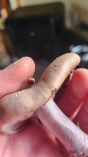 Der Stiel ist rosa-blau-weiß. Besondere Merkmale: faserig, knollige Basis, hohl, Wurzelbasis, genattert.