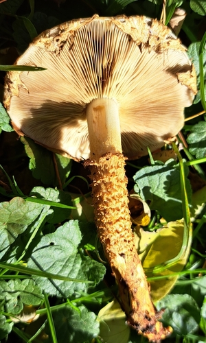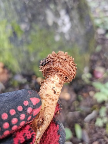Der Stiel ist braun-gelb-orange. Besondere Merkmale: Ring, faserig, flocken, Wurzelbasis, genattert.
