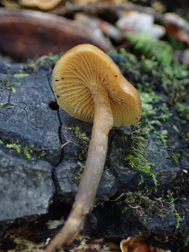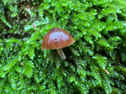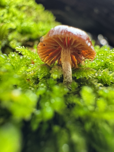 Der 1–6 cm breite Hut ist braun-orange-gelb-rot gefärbt. Die Form ist meist schirmförmig, andere, kegelförmig, geriefter Hut. Er ist hygrophan (Die Hutfarbe ändert sich bei Feuchtigkeit).