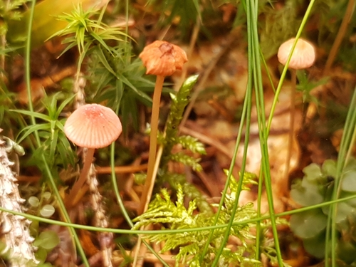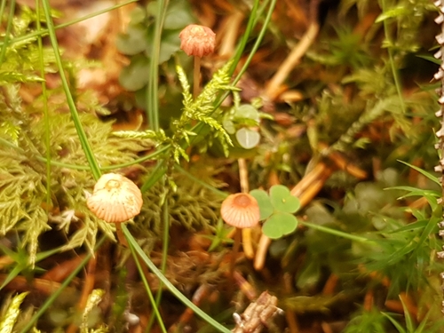 Der 1–2 cm breite Hut ist rosa-rot-weiß-orange gefärbt. Die Form ist meist andere, schirmförmig, kegelförmig, geriefter Hut. Er ist hygrophan (Die Hutfarbe ändert sich bei Feuchtigkeit).