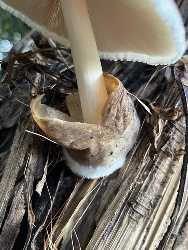 Der Stiel ist weiß-gelb. Besondere Merkmale: faserig, flocken, knollige Basis, genattert.
