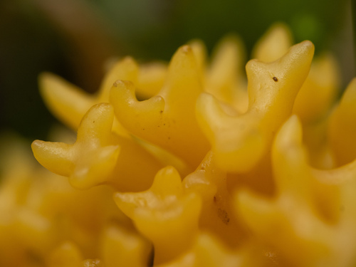 Der 1–20 cm breite Hut ist gelb-orange gefärbt.