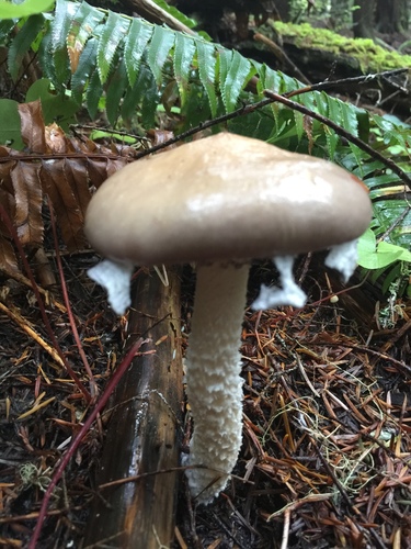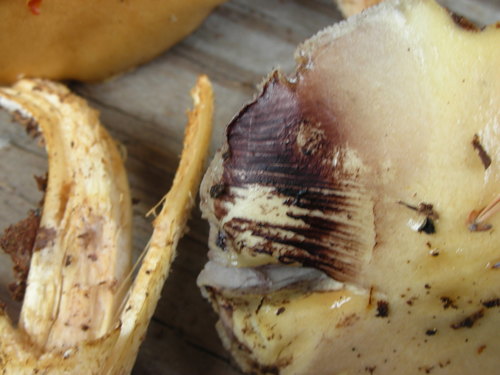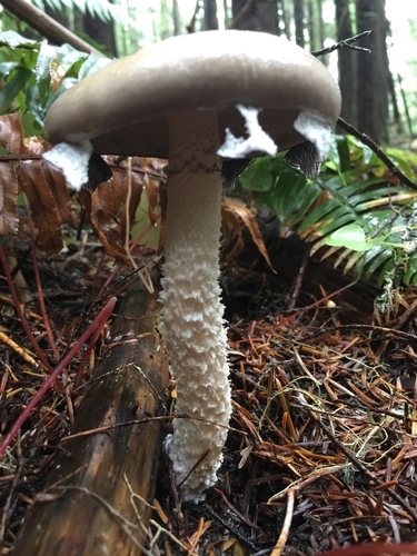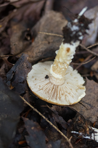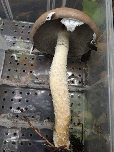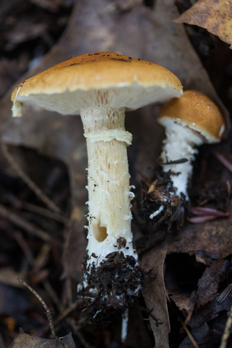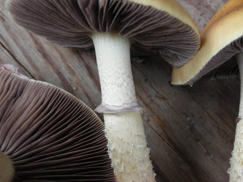 Der Stiel ist weiß. Besondere Merkmale: Ring, faserig, flocken, hohl, Wurzelbasis, genattert.