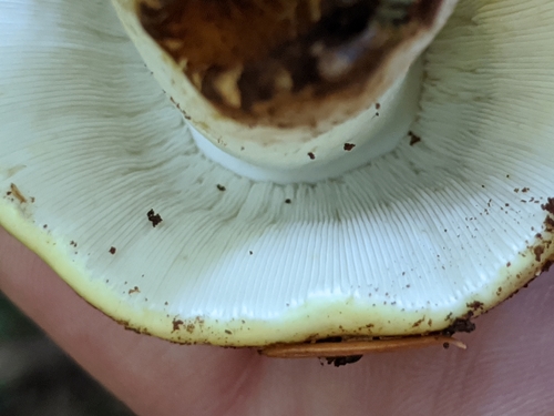 Die Unterseite zeigt Farben von weiß/gelb/grau/schwarz/rot. Sie sind angewachsen, frei.