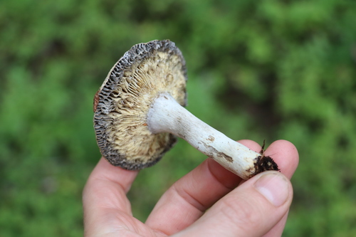 Der Stiel ist grau-weiß-rot. Besondere Merkmale: brüchig, Wurzelbasis, hohl.