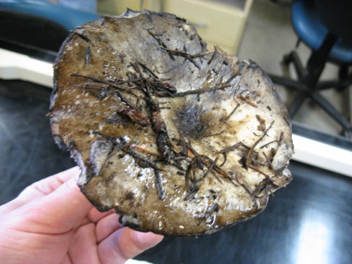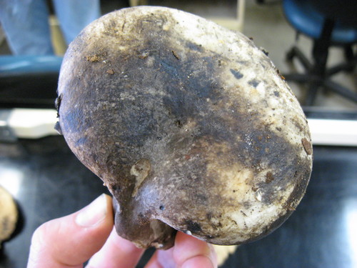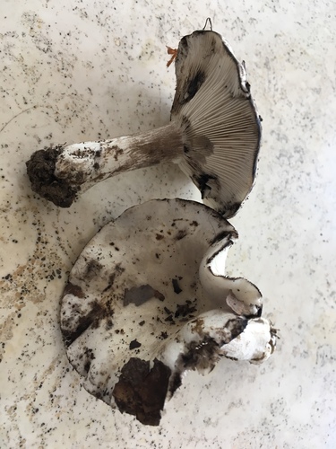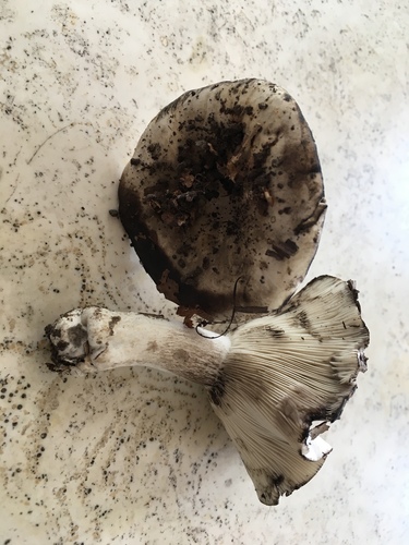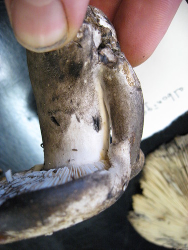 Der Stiel ist weiß-grau-schwarz. Besondere Merkmale: brüchig, hohl, Wurzelbasis.