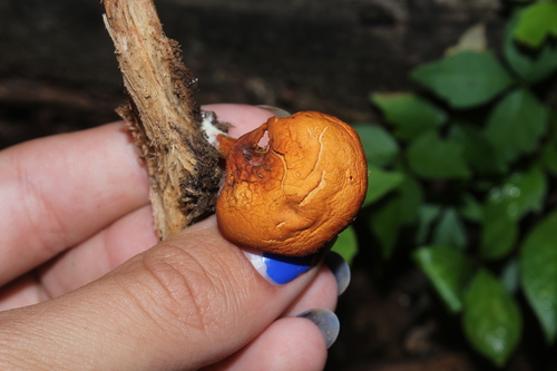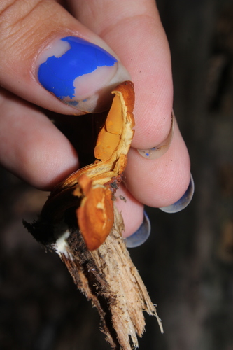 Der Stiel ist gelb-braun-orange-rot. Besondere Merkmale: faserig, genattert.
