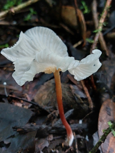 Der 1–6 cm breite Hut ist braun-orange-rosa-rot-weiß gefärbt. Die Form ist meist schirmförmig, trichterförmig, kegelförmig, geriefter Hut.
