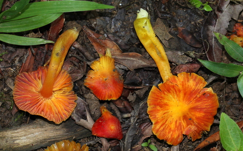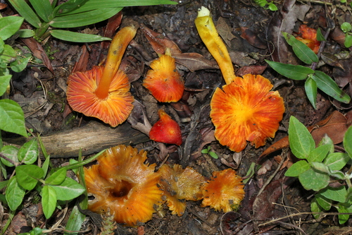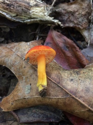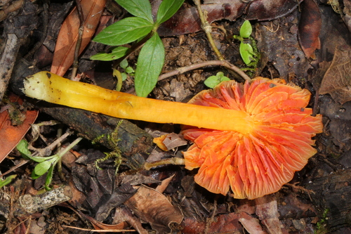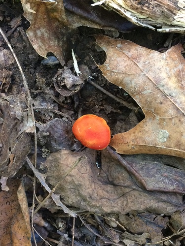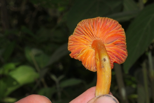 Der 2–6 cm breite Hut ist rot-orange gefärbt. Die Form ist meist andere, kegelförmig. Er ist hygrophan (Die Hutfarbe ändert sich bei Feuchtigkeit).