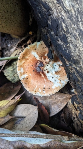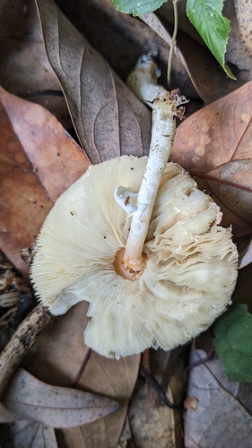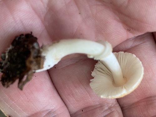 Der Stiel ist weiß-grau. Besondere Merkmale: Ring, flocken, hohl, Wurzelbasis, knollige Basis.