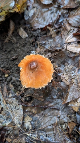 Der 2–9 cm breite Hut ist rot-orange-weiß-gelb gefärbt. Die Form ist meist kegelförmig, schirmförmig.