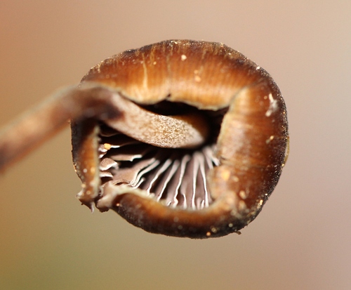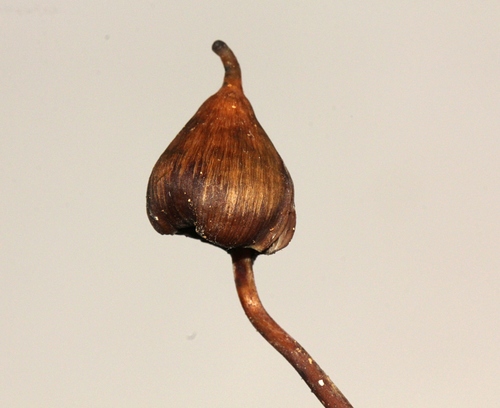 Der 1–3 cm breite Hut ist braun-blau-orange gefärbt. Die Form ist meist kegelförmig, andere. Er ist hygrophan (Die Hutfarbe ändert sich bei Feuchtigkeit).