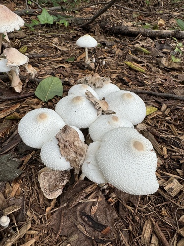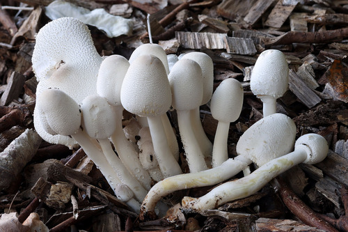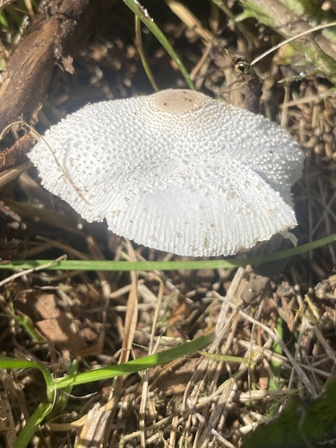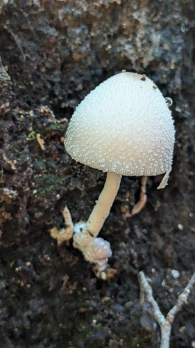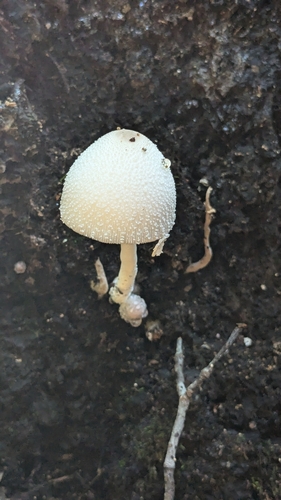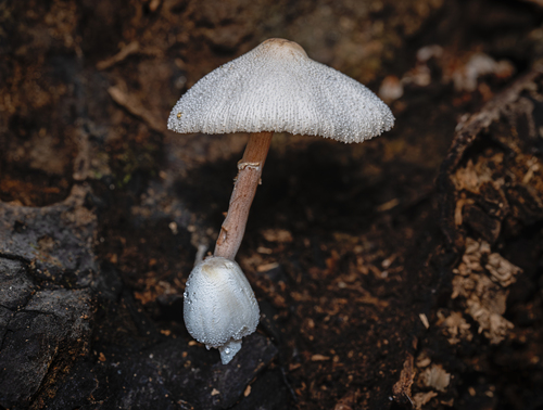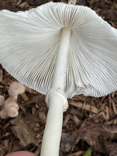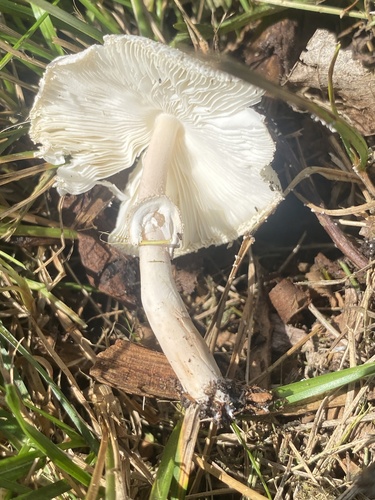 Der Stiel ist weiß. Besondere Merkmale: flocken, brüchig, Ring, hohl, knollige Basis, faserig, Wurzelbasis.
