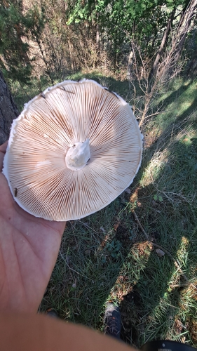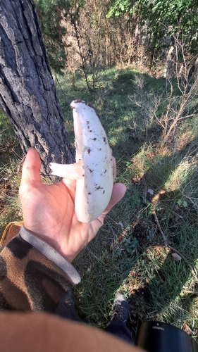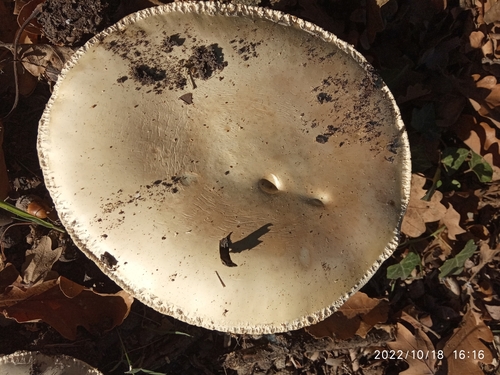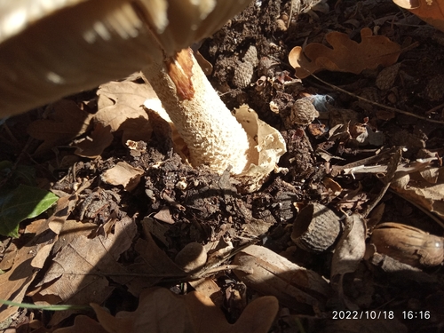 Der Stiel ist weiß-gelb. Besondere Merkmale: flocken, Ring, faserig, Wurzelbasis.