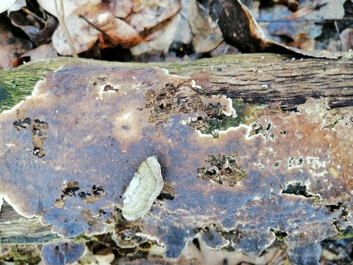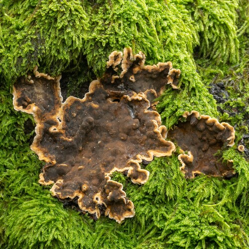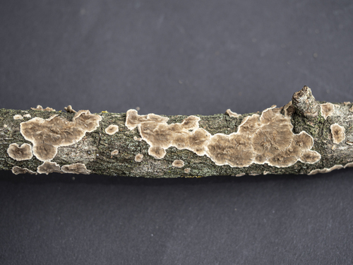 Der Rußbrauner Schichtpilz (Porostereum spadiceum) ist ein Pilz mit dem Speisewert ungenießbar. Die Hauptsaison erstreckt sich von Januar bis Dezember. Er wächst bevorzugt auf Holz.