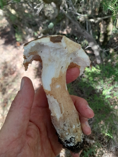 Der Stiel ist braun-weiß-orange. Besondere Merkmale: faserig, brüchig, Netz, knollige Basis.