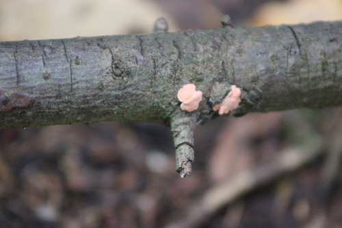 Der 1–2 cm breite Hut ist braun-orange-rosa gefärbt.
