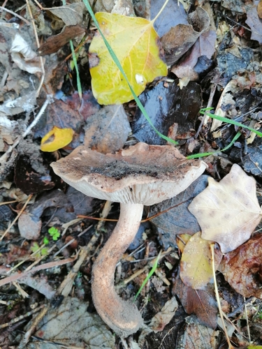 Der 3–15 cm breite Hut ist rot-braun-grau gefärbt. Die Form ist meist andere, kegelförmig. Er ist hygrophan (Die Hutfarbe ändert sich bei Feuchtigkeit).