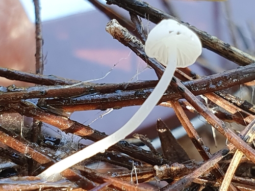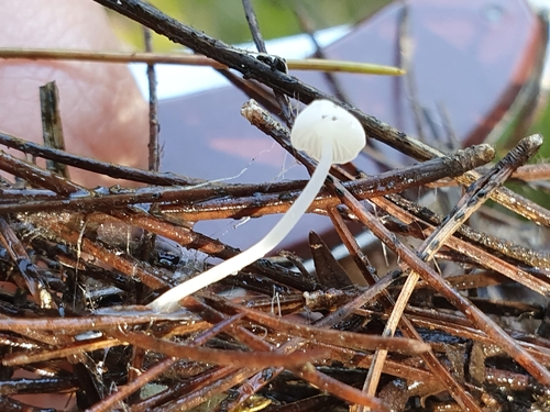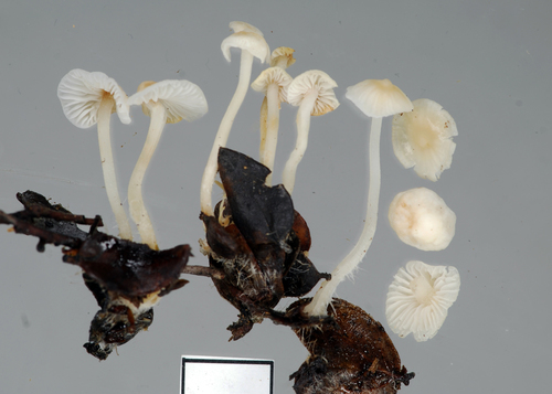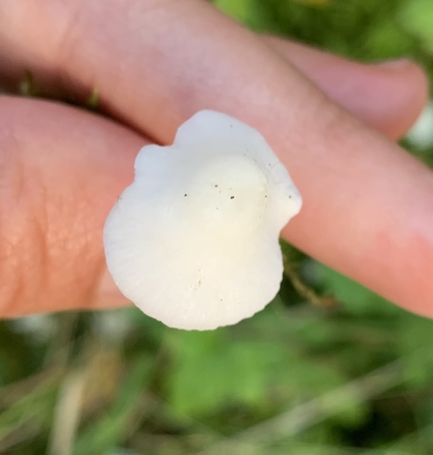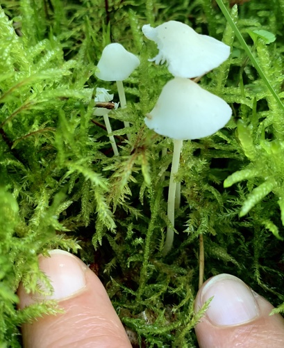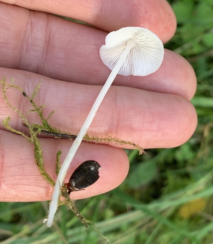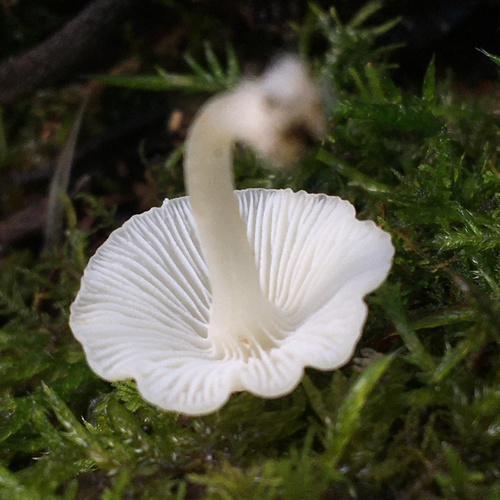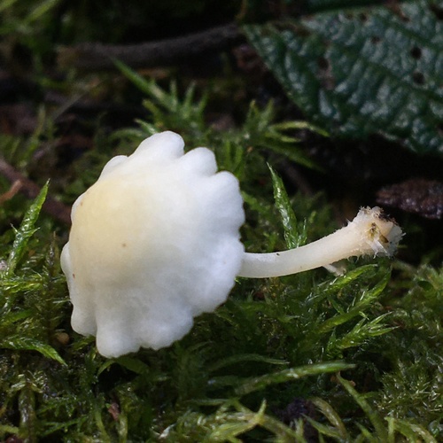 Der 1–2 cm breite Hut ist weiß gefärbt. Die Form ist meist kegelförmig, schirmförmig.
