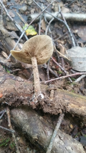 Der 1–5 cm breite Hut ist braun-grün gefärbt. Die Form ist meist schirmförmig, trichterförmig, kegelförmig.
