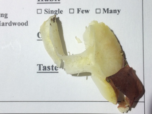 Der Stiel ist orange-gelb-weiß. Besondere Merkmale: brüchig, hohl.