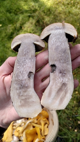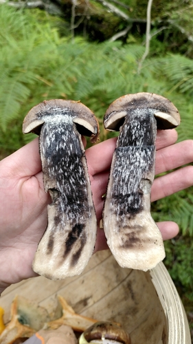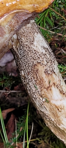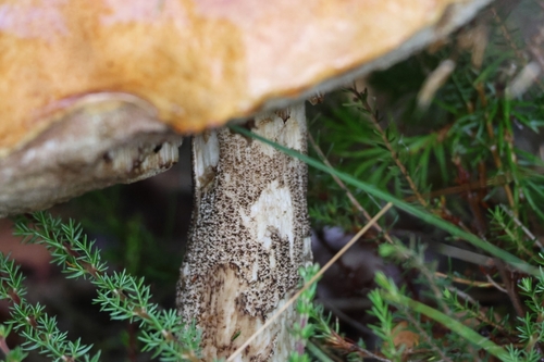 Der Stiel ist grau-weiß. Besondere Merkmale: faserig, flocken, Netz, genattert, brüchig.
