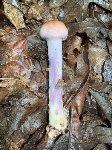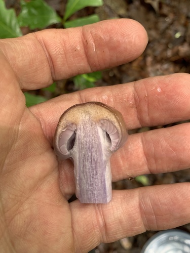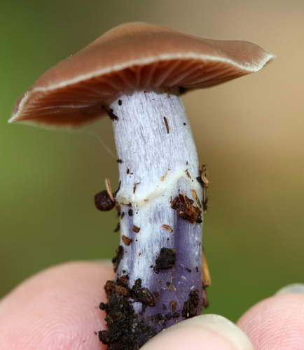 Der Stiel ist blau-grau-weiß-braun-gelb. Besondere Merkmale: faserig, knollige Basis, Ring, flocken.