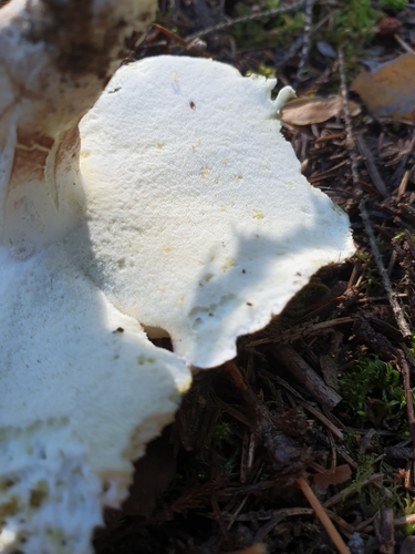 Die Unterseite zeigt Farben von gelb/weiß/grün/orange/braun/blau. Sie sind angewachsen, herablaufend.