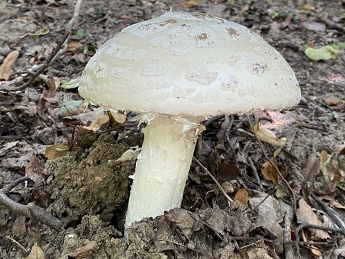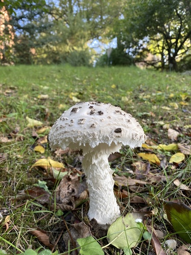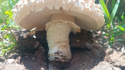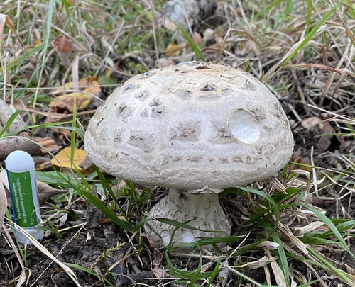 Der Stiel ist weiß-gelb. Besondere Merkmale: faserig, flocken, knollige Basis, Ring, genattert.
