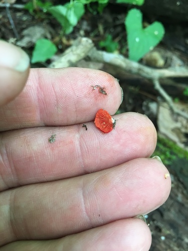 Der 1–4 cm breite Hut ist braun-rot-orange gefärbt. Die Form ist meist schirmförmig.