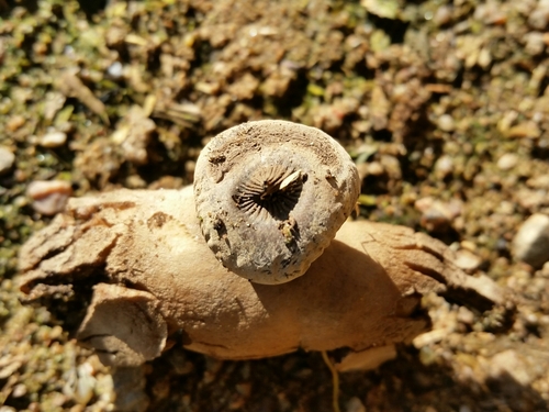 Der Stiel ist gelb-braun-rot-grau-orange. Besondere Merkmale: faserig, Wurzelbasis, hohl.