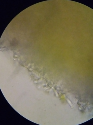 Der 1–2 cm breite Hut ist orange-gelb gefärbt. Die Form ist meist trichterförmig.