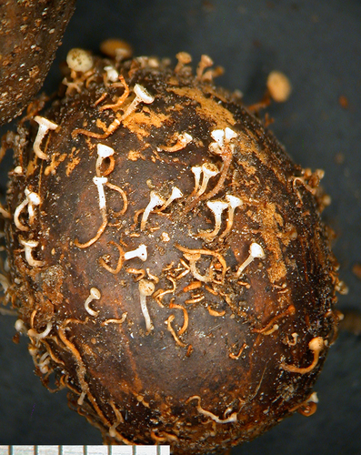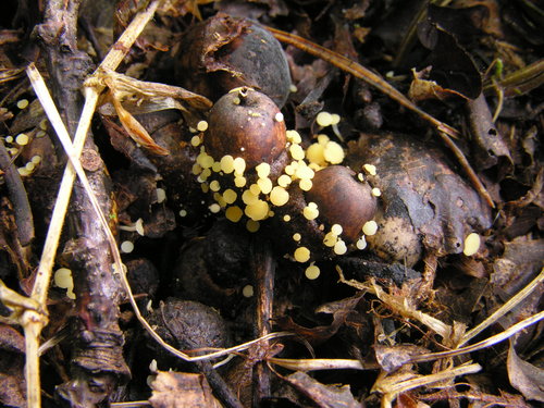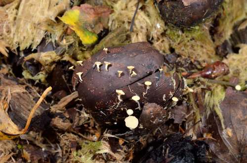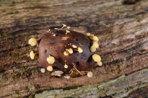 Der Fruchtschalen-Stängelbecherling (Hymenoscyphus fructigenus) ist ein Pilz mit dem Speisewert ungenießbar. Die Hauptsaison erstreckt sich von Oktober bis Dezember. Er wächst bevorzugt auf Holz.