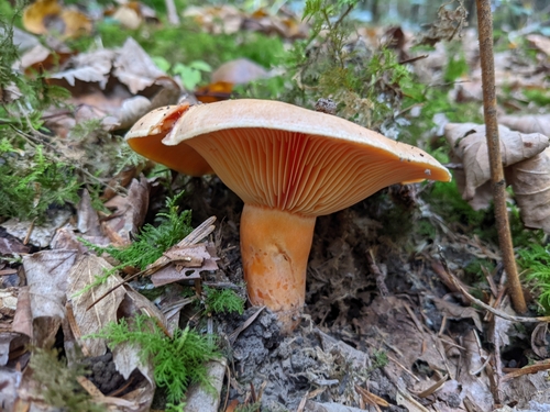 Der 3–16 cm breite Hut ist orange gefärbt. Die Form ist meist trichterförmig, andere, schirmförmig. Er ist hygrophan (Die Hutfarbe ändert sich bei Feuchtigkeit).