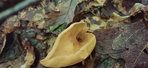 Der 1–9 cm breite Hut ist braun-orange-gelb gefärbt. Die Form ist meist trichterförmig.