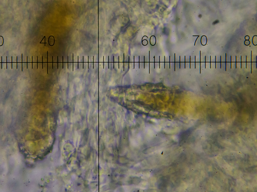 Der 1–25 cm breite Hut ist grau-weiß-gelb-blau gefärbt. Die Form ist meist kegelförmig.