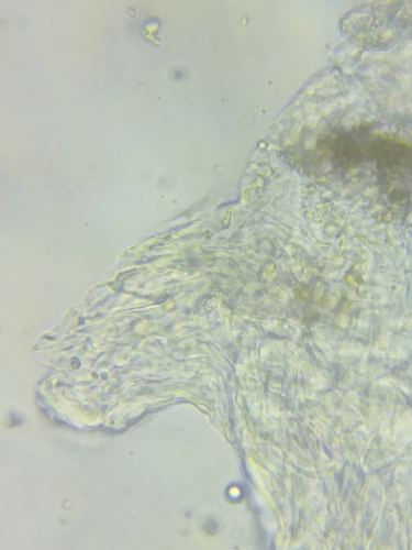 Der Stiel ist orange-weiß-grau-gelb-braun. Besondere Merkmale: faserig, Wurzelbasis.