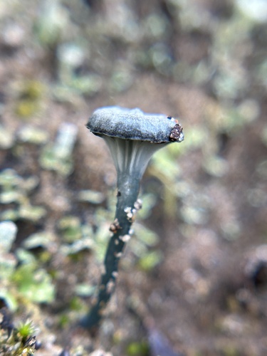 Der 1–3 cm breite Hut ist blau-grün-weiß gefärbt. Die Form ist meist trichterförmig. Er ist hygrophan (Die Hutfarbe ändert sich bei Feuchtigkeit).